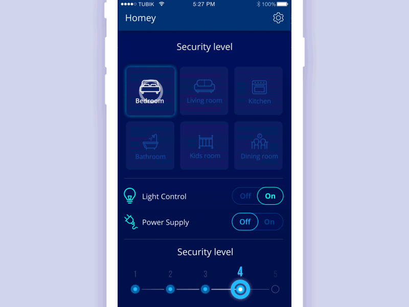 Homey App is an interface with «smart home» functionality. The featured screens show that users can choose the room and see the basic data about them like temperature, humidity, and energy consumption, can tune the settings and see the expenses as well as turn saving mode and security of different levels.